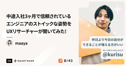 こんにちは!スマートバンクでUXリサーチャーをしているmaayaです。 スマートバンクでは、様々な分野で活躍しているメンバーが揃っており、経歴や社歴の違いはあれど、全員がプロフェッショナルの意識をしっかりと持っています。 私はリサーチャーとして、チ…
