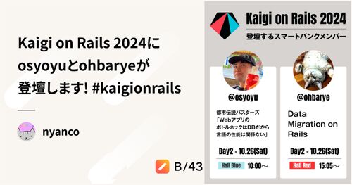 こんにちは、nyancoです。 いよいよ今週末にKaigi on Rails 2024が開催されます! 本日はKaigi on Rails 2024で登壇する株式会社スマートバンク社員2名(osyoyuさん,ohbaryeさん)に登壇の意気込みや見どころについて聞いてきたのでブログにしてみます。 都…