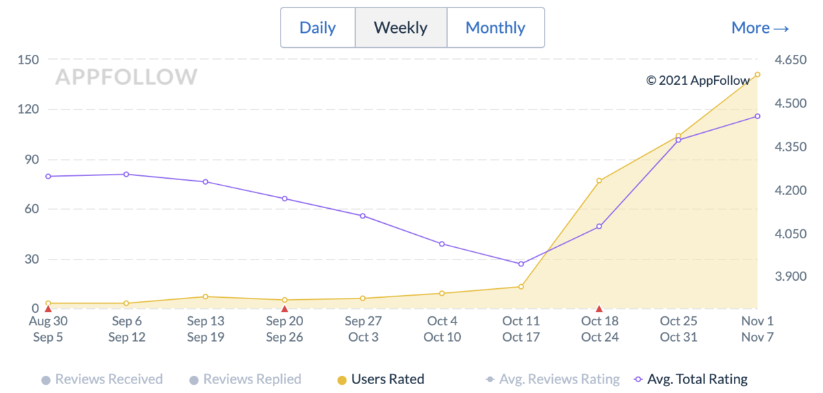 このリリース以後、App Storeで「B/43」アプリに対するユーザーからの評価が2週間ほどで3.9点から4.5点まで上昇しました。また点数だけでなく評価の回数も大幅に増加しており、週あたりの評価回数はおよそ10回→100回+となっています。