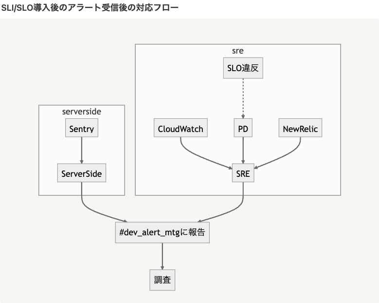 そこで現状のアラートを受け取ってからの対応フローを整理し、SLOアラートを加えたフローを考え簡単な図にしました。
