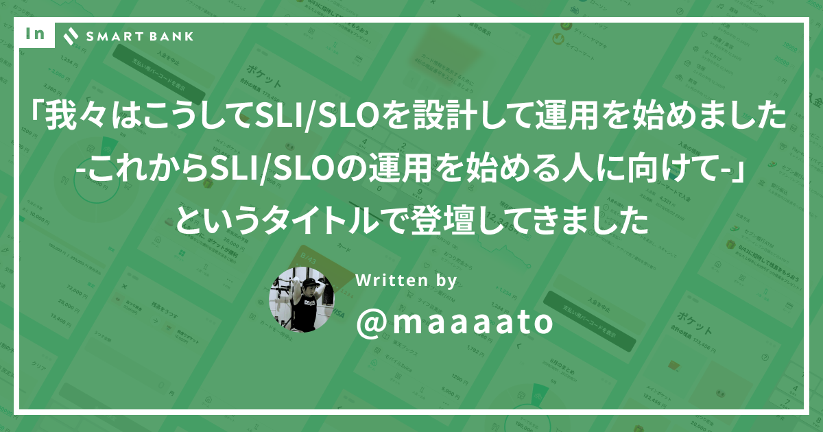 前半ではCUJ/SLI/SLO/エラーバジェットについて改めて確認し、株式会社スマートバンクにおけるSLI/SLOの運用の現状について説明しています。 後半ではSLI/SLOの設計・運用のアプローチをどのように進めたのか、最後にまとめと今後の展望について説明しています。 主にSLI/SLOをこれからやっていこうと思っている人、運用開始しているけど他社の事例が気になる人を想定聴講者としつつ、当時自分がSLI/SLOの設計するに辺りこんな資料があると嬉しかったという点を踏まえてまとめました。