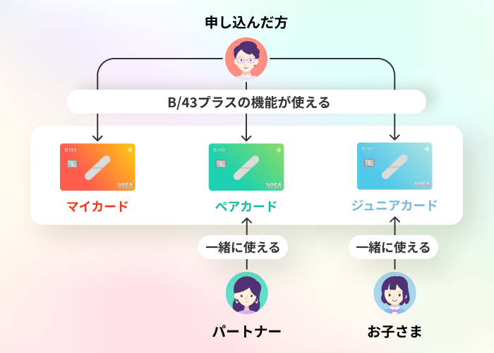 B/43はパートナーやお子さまとご一緒に利用できる家族の家計管理サービスです。そのため、B/43プラスの機能は申し込んだ方のカードに紐づくパートナーやお子さまも一緒にB/43プラスの機能をご利用いただける仕様としています。