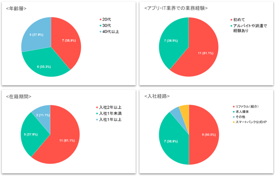 また、在籍期間1年以上が約9割を占めていて離職率が低いのも特徴です!求人媒体や株式会社スマートバンクの採用ページでも募集をしていますが、実際に働いているメンバーが「働きやすい」と感じて友人・知人を紹介してくれるケースも多いです。