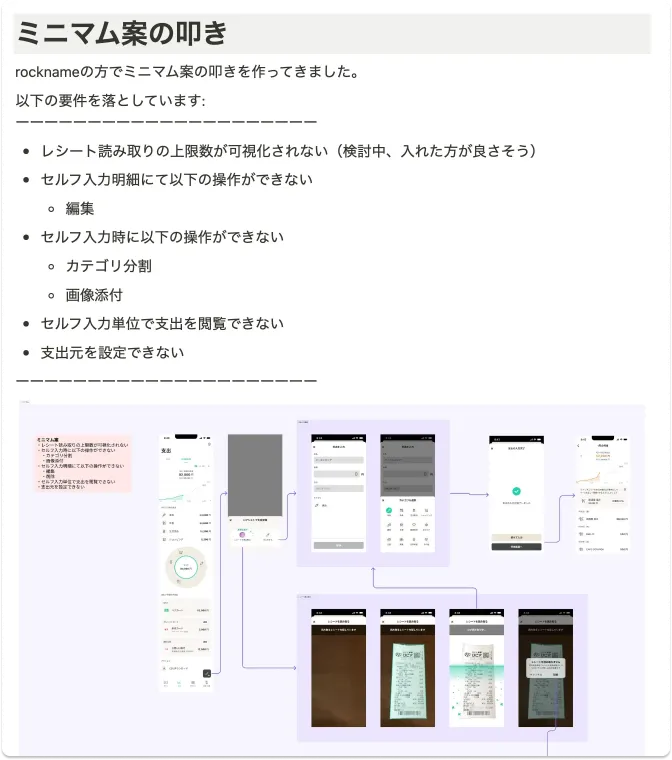 この資料を元に、PM・デザイナー・エンジニア交えて職能横断でミニマムについて議論を進めました。