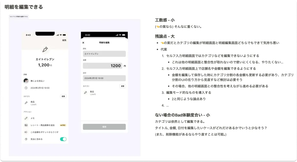 さらに、切り出した機能単位で「工数感」と合わせて「残論点」「体験面」を大・中・小という単位でスコアリングし、機能ごとの画面をFigmaで組み上げて資料に書き起こしていきました。