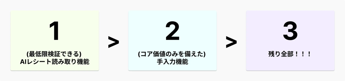 例えば、先日リリースしたAIレシート読み取り・手入力機能では、まずはより不確実性の高いAIレシート読み取り、次に手入力機能のコア価値に対して、それぞれ最短でフィードバックをもらえるように実装の優先度付けを行いました。