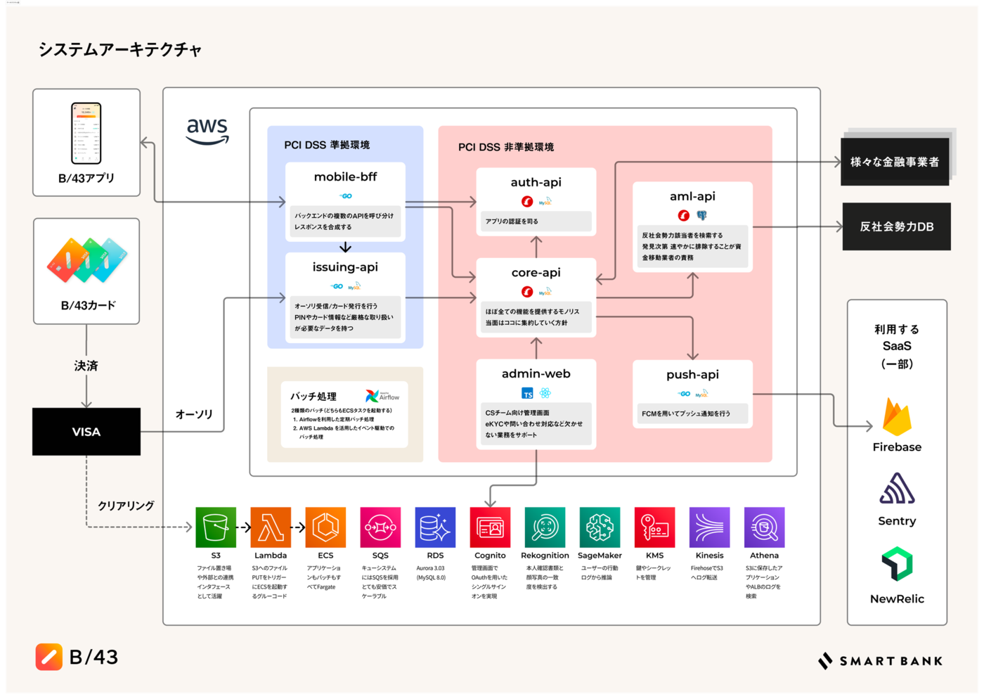 「株式会社スマートバンクって技術力が高くて“つよつよエンジニア”ばっかりなんでしょ?」と思う方もいるかもしれません。しかし、システム的には良い意味で普通だと感じます。PCI DSSといった金融ドメイン特有の縛りが一部にはありますが、そこを除けば派手な技術や特殊なアーキテクチャを採用しているわけではなく堅実でシンプルな設計になっているかと思います。