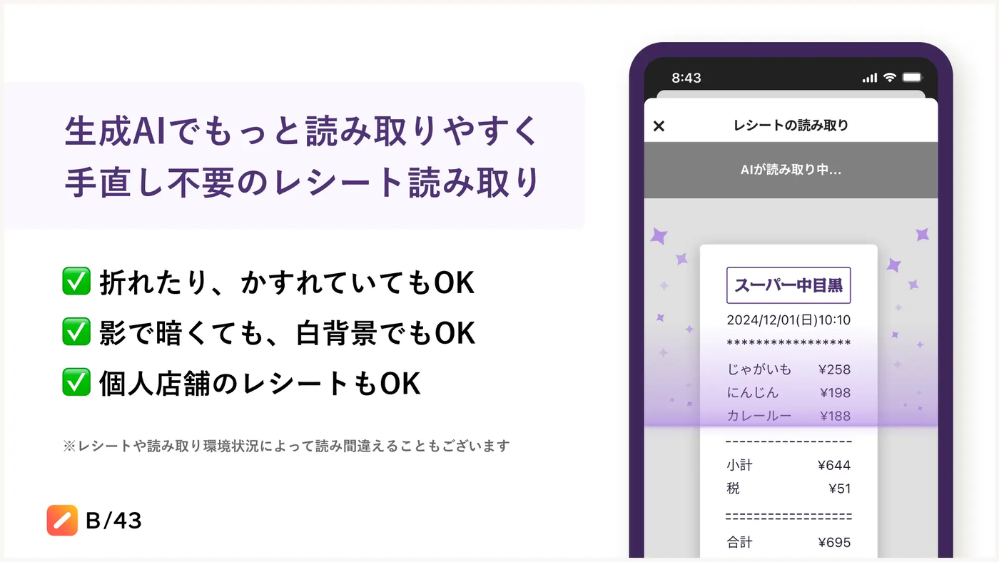 最近リリースされた「レシート読み取り」機能も素晴らしいです。これを使えば、B/43以外の支払いも簡単に家計簿に登録可能です。しかも読み取り精度が高く、自分はシワクチャのレシートも読み取れました。すごい!