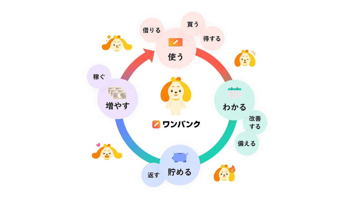 ワンバンクの目指すところは、お金にまつわる「使う」「わかる」「貯める」「増やす」をワンバンクというひとつのプラットフォームで提供することです。