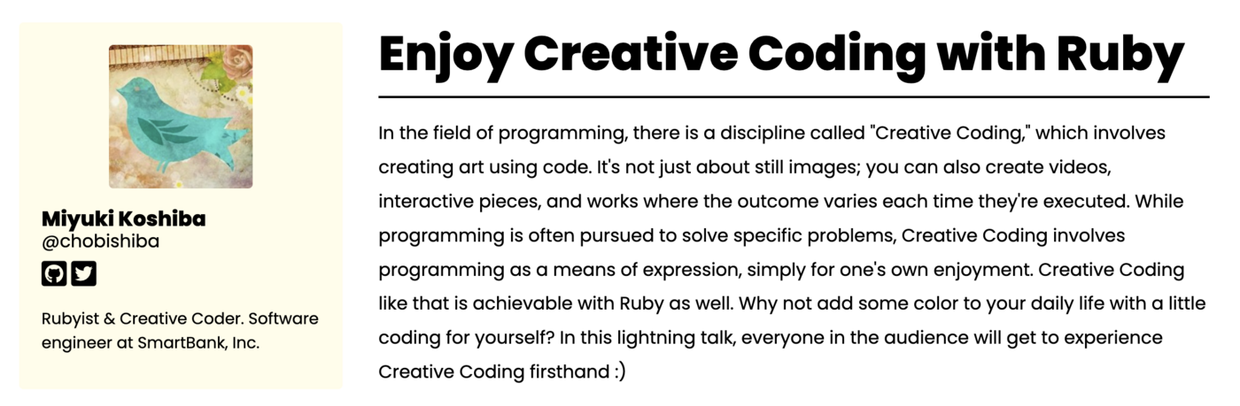また、2日目のLightning Talksには弊社Miyuki Koshiba(@chobishiba)が「Enjoy Creative Coding with Ruby」というLTをします!ぜひお楽しみに!!