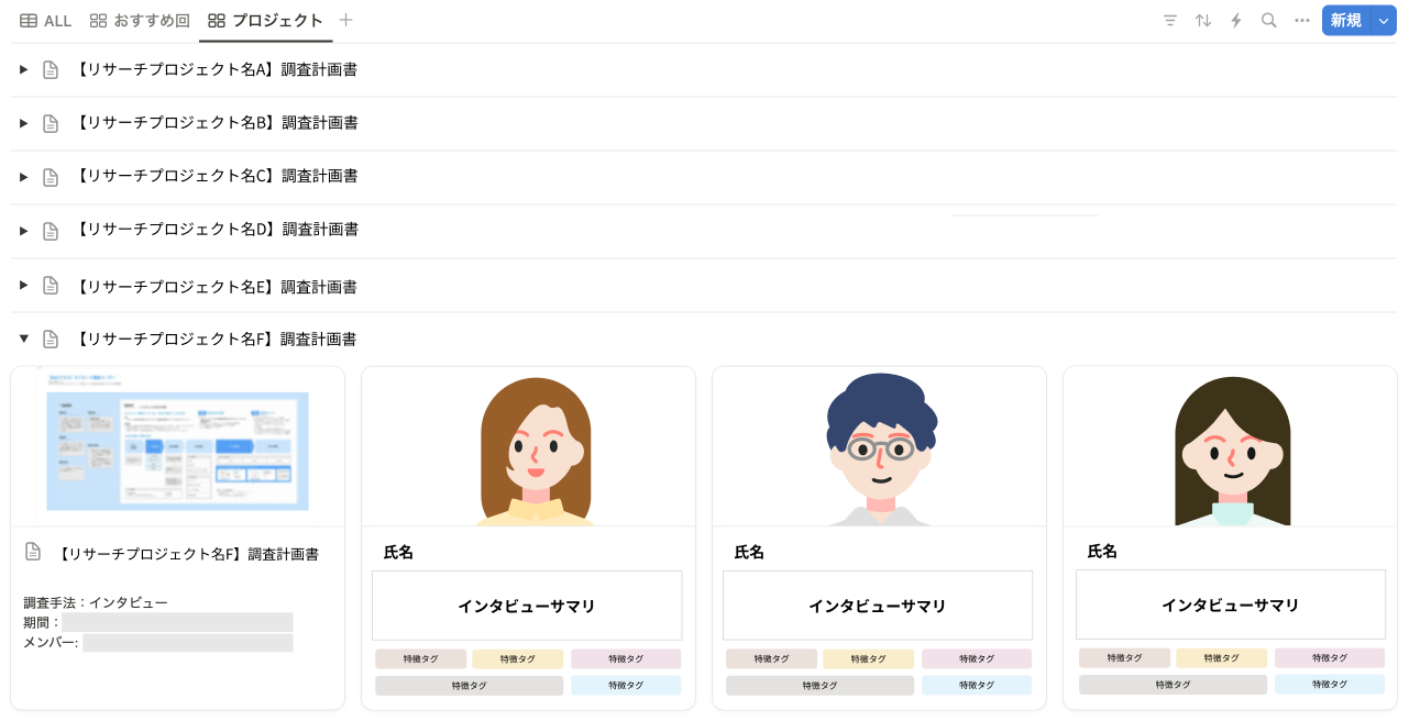 テーブルレイアウトだと時系列にインタビューが並んでいて、アサインするプロジェクトごとの全体像や流れが把握しづらい