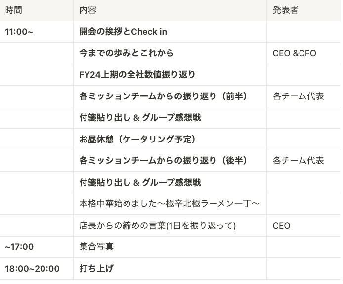 そこで、「課題感の解決のきっかけとなる場にするにはどうしたらいいか?」を企画メンバーで考え、3つの柱「丁寧な前提共有を意識したチームごとの発表」「疑問を深掘りできる感想戦」そして「本格中華」を中心としたタイムテーブルを決定しました。