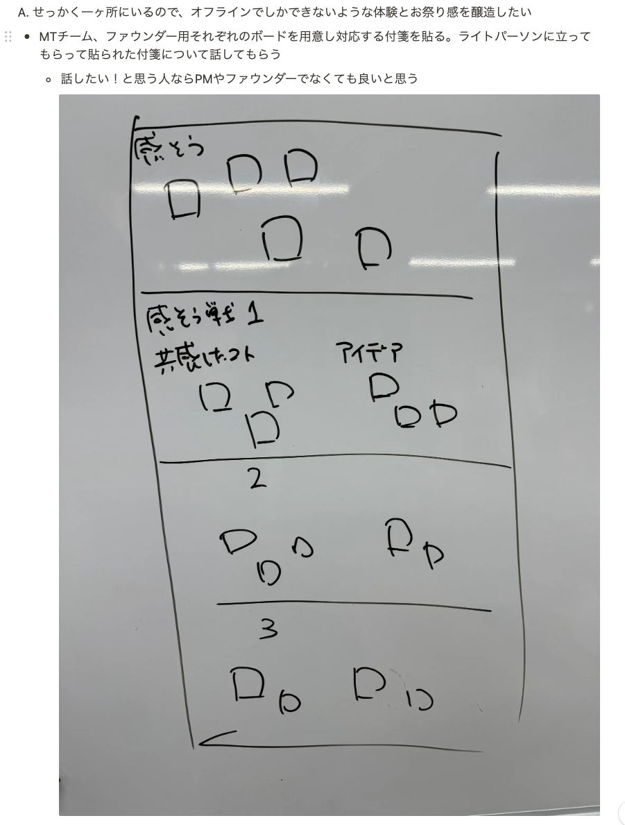 発表を行った各ミッションチームや職種ごとにボードを用意し、参加者が自由に疑問や気になった点を付箋に書き込んで貼り付ける形式を採用しました。発表者はそれをもとに回答や補足と議論を行い、直接やり取りを通じて認識のすり合わせや議論を深めることを目指しました。