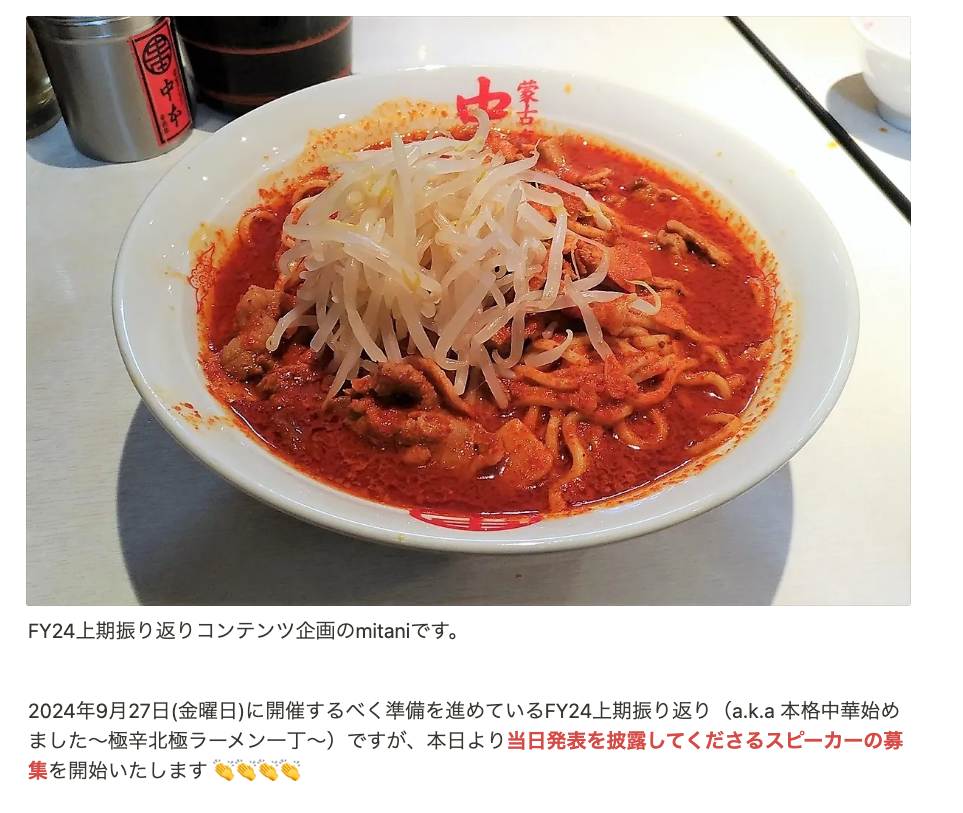 今回はその「本格版」として、各自が胸に抱える会社への想いをLTとして発表してもらう「本格中華〜極辛北極ラーメン一丁〜」をコンテンツのトリとして設けました。